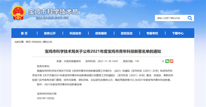 寶雞市科學(xué)技術(shù)局開展2021年度寶雞市青年科技新星培育計劃推薦工作旨在深入實施創(chuàng)新驅(qū)動發(fā)展戰(zhàn)略,加快促進科技、金融、產(chǎn)業(yè)、人才有機結(jié)合,培育我市高質(zhì)量發(fā)展急需的優(yōu)秀青年科技人才隊伍。